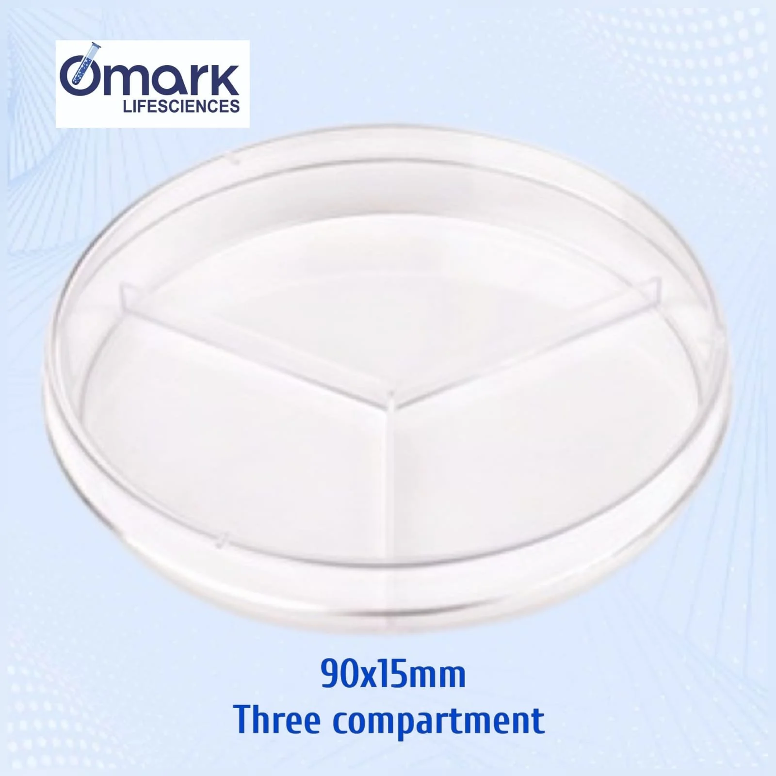 Product Description: Petri Dish ( PS) ,3 Compartment , 90 x 15 mm, vented, Sleeves of 10, Gamma Sterile* RIM FEATURE :STACKABLE DATA SHEET THREE COMPARTMENT PETRIDISH